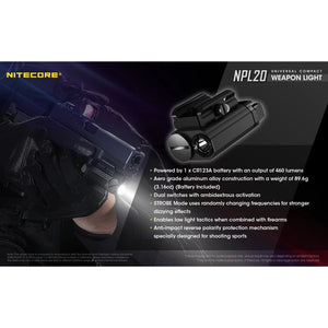 Podvěsná zbraňová svítilna od Nitecore NPL20 je universální podvěsná svítilna. Jako zdroj světla je použita LED dioda CREE XP-G3 S3 s maximálním dosvitem až 76 metrů. Napájení zajišťuje 1 x CR123A s dobou použití až 50min. NPL20 má možnost volby mezi silným světlem a jedním speciálním módem tj. stroboskop s proměnlivou frekvencí. Svítilnu lze ovládat jak silnou, tak i slabou rukou za pomoci páček, které se nacházejí před lučíkem zbraně. NPL20 lze lehce nasadit na většinu zbraní opatřených Picatinny railem za pomoci upevňovacího šroubu. Přední čočka je oboustranně potažena vrstvou proti poškrábání, stupeň krytí IP67 a nárazuvzdornost je testována z výšky 1 metru. Tělo je vyrobeno z leteckého hliníku s černým eloxem HAIII military.