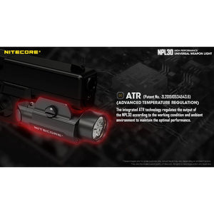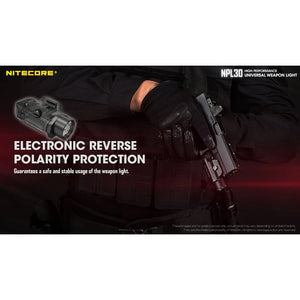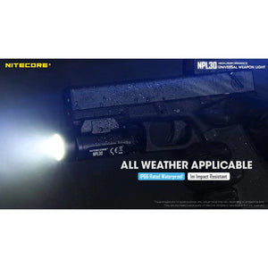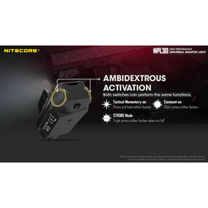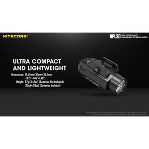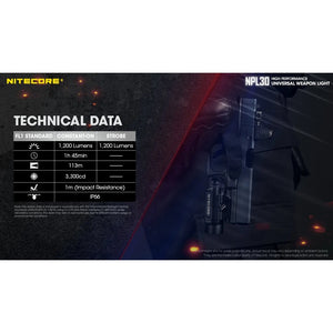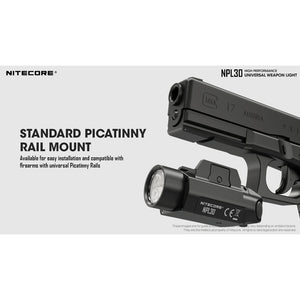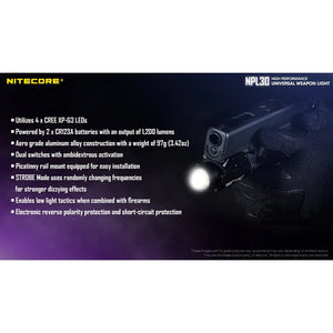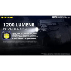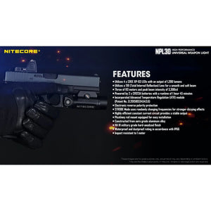 Podvěsná zbraňová svítilna od Nitecore NPL30 je universální podvěsná svítilna. Jako zdroj světla jsou použity 4 x LED dioda CREE XP-G3 S3 s maximálním dosvitem až 113 metrů. Napájení zajišťuje 2 x CR123A s dobou použití až 1 hod 45 min. NPL30 má možnost volby mezi silným světlem jak momentovým, tak konstantním a jedním speciálním módem tj. stroboskop pro lepší oslnění útočníka. Stroboskop se aktivuje 3 x stisknutím tlačítka ovládání svítilny za sebou. Svítilnu lze ovládat jak silnou, tak i slabou rukou za pomoci tlačítek, které se nacházejí před lučíkem zbraně. NPL30 lze lehce nasadit na většinu zbraní opatřených Picatinny railem za pomoci upevňovacího šroubu. Přední čočka je oboustranně potažena vrstvou proti poškrábání, stupeň krytí IP66 a nárazuvzdornost je testována z výšky 1 metru. Tělo je vyrobeno z leteckého hliníku s černým eloxem HAIII military.